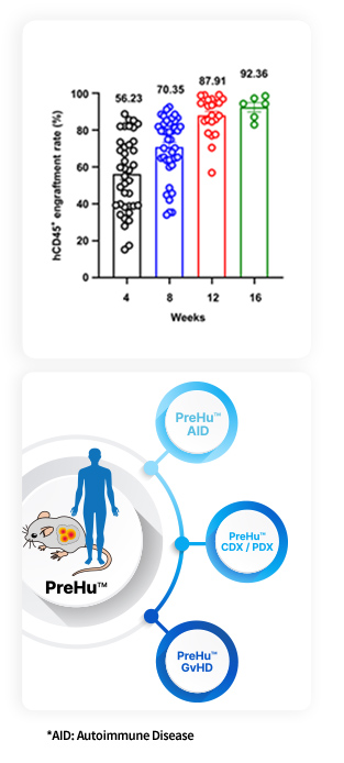 PreHu™-H 모델은 최대 6개월 이상의 연구 기간과 T 세포 및 B 세포 의존적