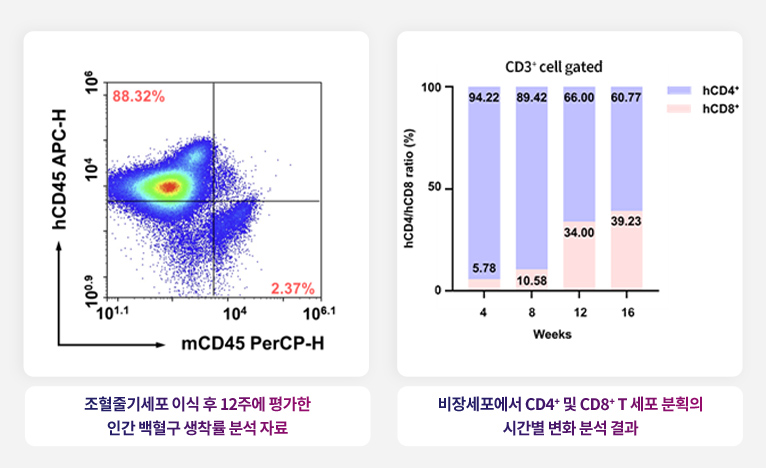 HIS를 재구성하며 인간 면역세포의 견고한 다계통 생착을 이룰 뿐 아니라,